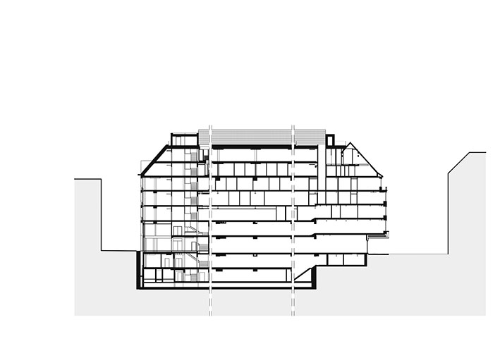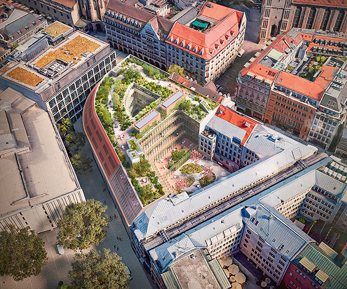 The task is to preserve the character of the postwar buildings while transforming the heterogeneous conglomerate of structures, construction periods, and façade designs into a new urban building block. The concept therefore предусматривает retaining 75 percent of the existing structure. The aim is to preserve as much of the building fabric as possible while integrating state-of-the-art technologies to reduce primary energy demand and enable the use of renewable energy sources such as photovoltaics. The planning goal is to develop a multifunctional building that meets contemporary requirements in terms of usability, flexibility, and sustainability. Each floor is designed to accommodate flexible functions while offering high-quality spaces for both use and stay. A mixed-use concept has been selected: retail will occupy the basement level (UG 1) through to the first floor (OG 1). Existing residential units will be relocated and preserved as part of the restructuring, while the upper floors will house the aforementioned flexible office spaces, enabling modern working environments. Newly created open spaces on rooftops and within courtyards are intended to improve the microclimate and, through their specific design, promote biodiversity in the urban environment. All new construction measures are designed to be as CO₂-neutral as possible, supported by the selection of materials such as recycled concrete. Ultimately, it is the role of the architectural language and detailing to strengthen the ensemble — with its preserved and formally updated presence — as a defining element of the city center’s identity, ensuring it remains relevant and adaptable for future uses and generations.