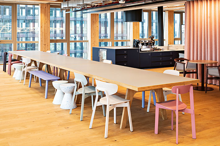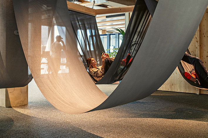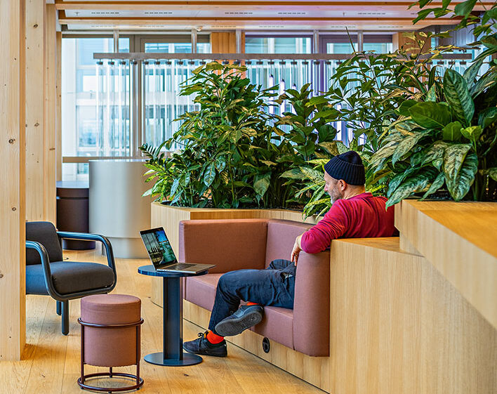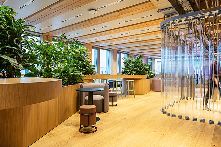 Drees & Sommer designed a new working environment for such a consulting company, comprising 2,454 square meters of office space in a timber hybrid building in Berlin. The brief included 128 permanent workstations, as well as considerations such as diversity, inclusion, and sustainability. The design was intended to be both brand-appropriate and forward-looking. The interior concept complements the fully equipped workstations with generous relaxation areas, including balconies on every floor, a green terrace, and quiet zones within shared spaces. Additional facilities include meditation rooms, a parent-child room, and a prayer room — making it a place where people can truly feel at ease. From smart meeting rooms to event spaces and stages for guests, the workspace offers a wide range of functions. It is flexible in use, adaptable to future requirements, and, of course, designed to be barrier-free. Custom solutions with a high level of detail and sustainable materials characterize the interior design, which is also dedicated to fostering creative processes and diverse modes of work. Digital and analog activities are seamlessly integrated, connections and interactions find their place intuitively — and even a “New Work etiquette” has become part of this new working environment.