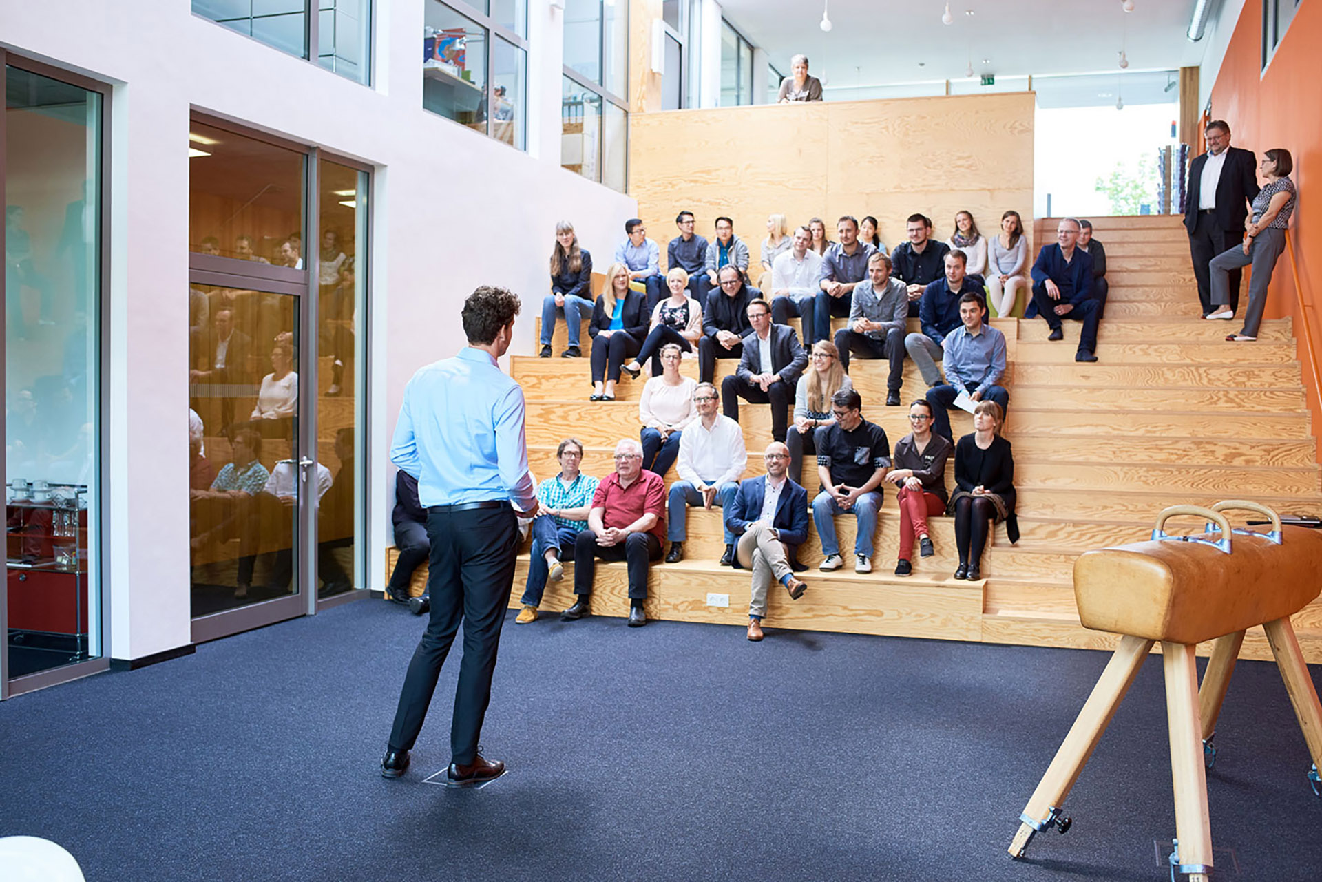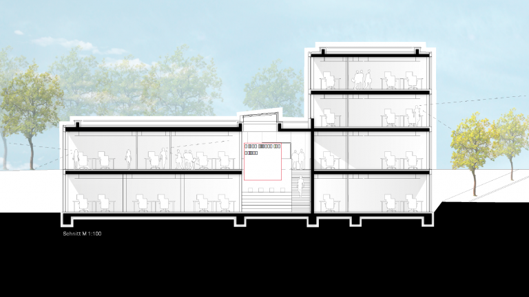 The Blue Office is designed for flexible use, with six independent rental units. Users may individually adapt the open, modular office areas. The southern part of the building can equally be used as open office space, seminar space or exhibition space with an outstanding event location. Both the four-storey north component and the two-storey southern component of the building reveal a view of the surrounding landscape. A transparent element, containing the main entrance, open meeting areas and a cafeteria, connects the two units. Maximum energy efficiency was achieved through an optimal ratio of building surface to volume and a highly insulated facade. In addition, the exhaust heat from the server room is integrated.
