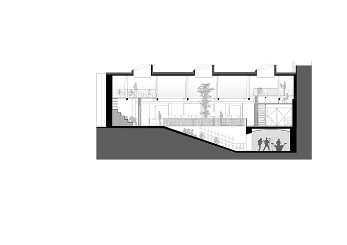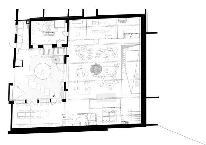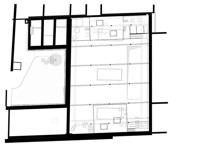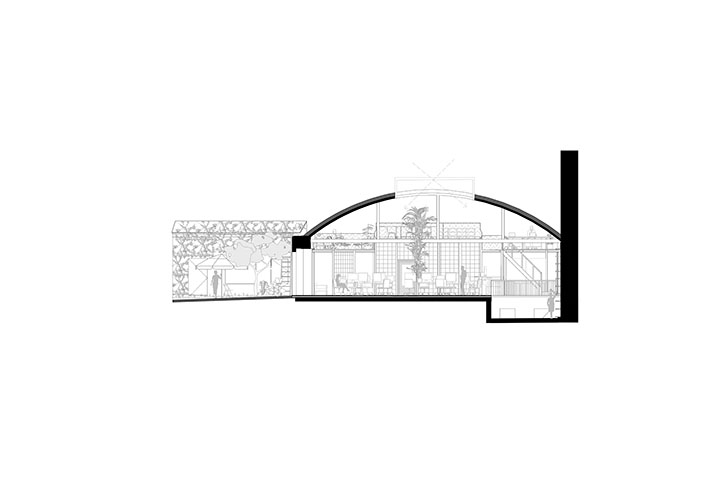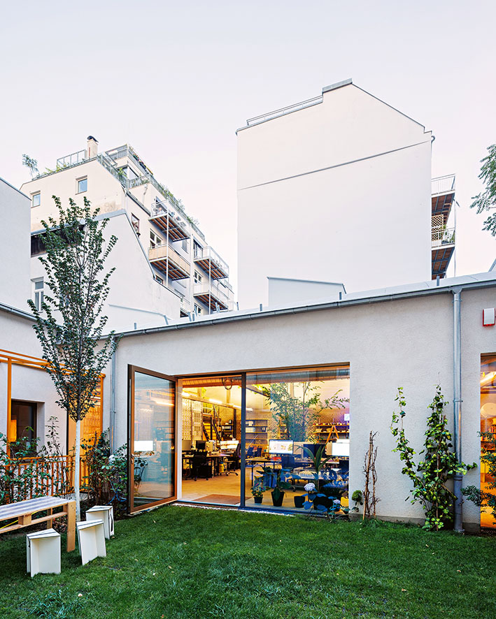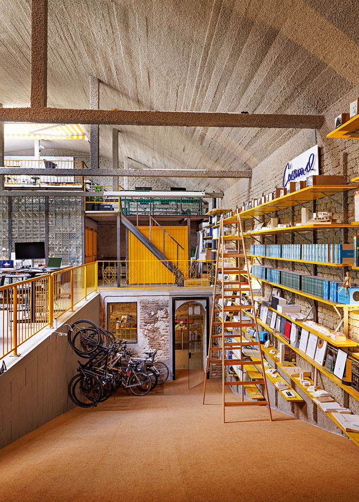 Architectural firms are among the economic actors who make their living by designing new things—or at least redesigning them. An indispensable service that must be provided responsibly. When Caramel began to design its new office location, the principle of of reuse as the guiding principle from the very beginning. A 1950s-era utility building situated in the backyard was planned and eventually occupied; with its very distinctive space, it immediately appealed to the architects’ already creative working style: a hall with a barrel vault, 5.5 meters high, with three large skylights at the apex—the ideal location for a work environment based on collaborative, communicative interaction, designed both functionally and symbolically “on one level.” The renovation brought to light relics worth preserving from the building’s past use as a workshop; a ramp dating from the pre-war period was discovered and uncovered. Its characteristic slope complements the spatial interplay and now provides access to a party cellar in the basement. The ground floor was designed as an open office, with a central podium in the middle dedicated to meetings, lectures, or group activities. Piece by piece, the workspace was assembled from old iron and steel elements, garage doors, and glass blocks, with the technical systems left exposed. For the