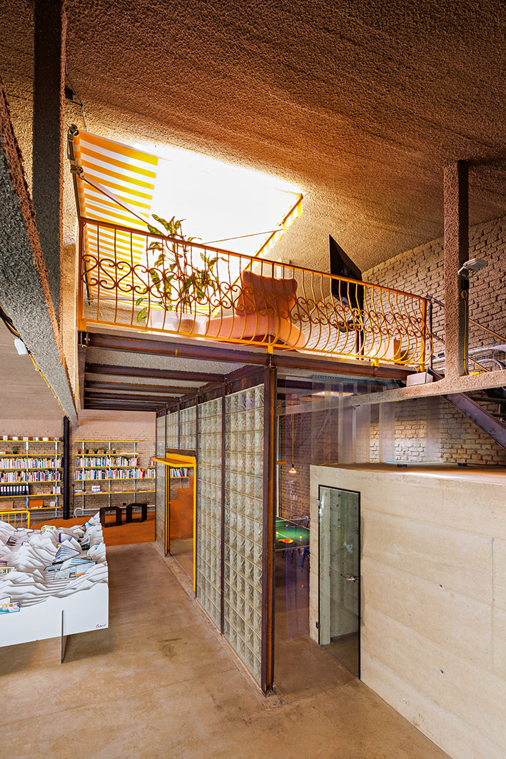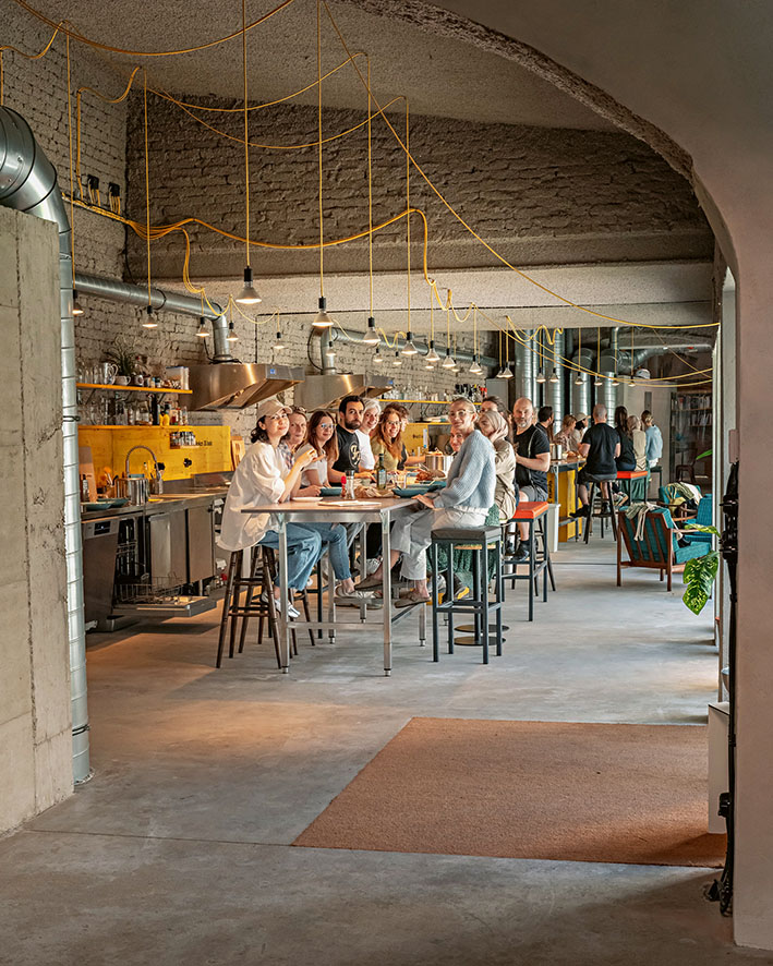 acoustic sprayed plaster, waste paper was used—unbleached and bound with natural glue. Everything was sourced inexpensively from existing stock or the internet, with each incorporated object lending the space new aesthetic charm and narrative elements. The Caramel team now fits into this environment as if it were second nature. It has become just as welcoming as it is inspiring. And that is exactly what matters.