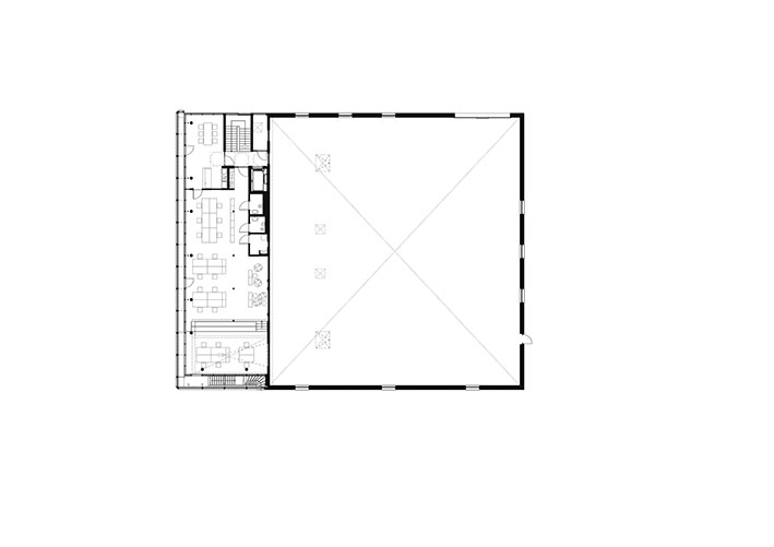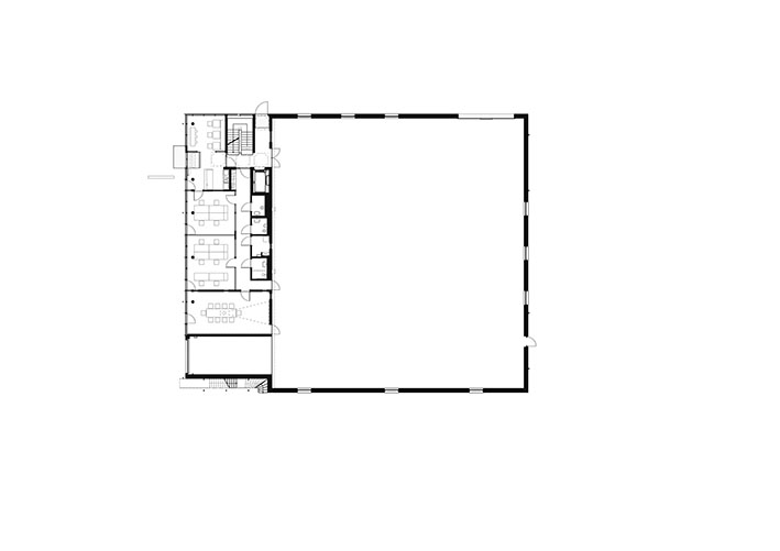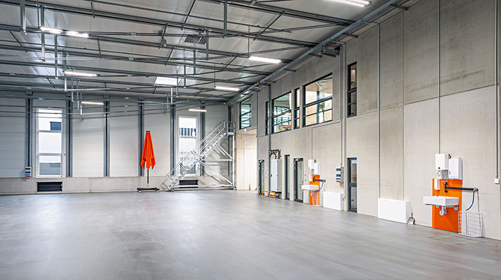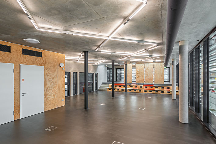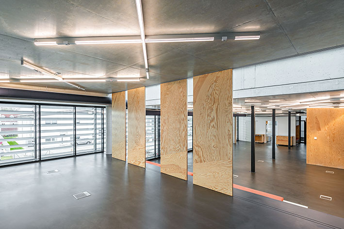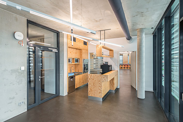 Innovation, however, is essential, and it requires space and opportunity. One such opportunity is the new concept of the Industrial MakerSpace. With its working environment, it forms the physical core around which the activities of the Community Transformation, Innovation Services, Venture Capital, and Design Collective are organized. More concretely: what we find here in Landsberg is an “all-inclusive location” that makes creative processes easier. All users operate their own facilities but have access to shared workshops, work in offices and team spaces, and can host events, workshops, and conferences. Ongoing administration for tenants is deliberately kept to a minimum; costs are based on the number of workstations used and the level of investment in the required technology. How clever is that! Architecturally, the Industrial MakerSpace, realized by vonMeierMohr Architekten, can be described as follows: everything is distributed across a total area of 1,488 square meters. Dominating the space is a large, square workshop hall with windows on three sides. It features an access gate and an integrated, climate-controlled truck entrance. After all, work inside should be able to continue under comfortable conditions even during loading and unloading in winter. To the west lies a 246-square-meter, two-story office wing. It houses the management team of four employees as well as 30 permanent workstations, distributed across offices of varying sizes and an open-office area. A lounge, tea kitchens, printer rooms, a large multifunctional space, and an “Open Light Room” equipped with media technology for presentations and events complete this innovation hub for industry, commerce, innovators, and start-ups: Think + Make!