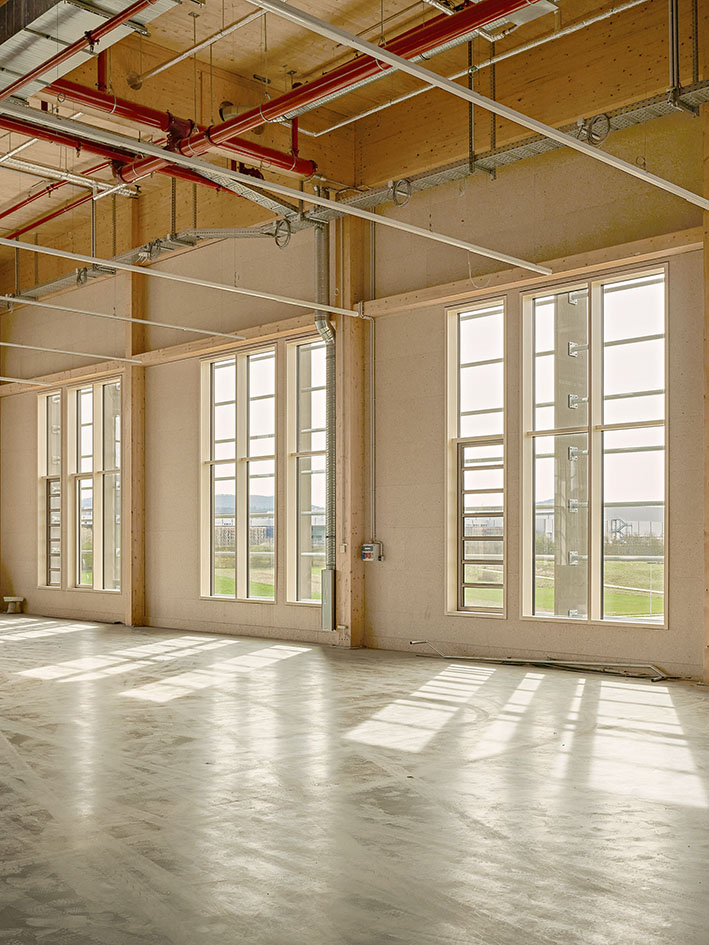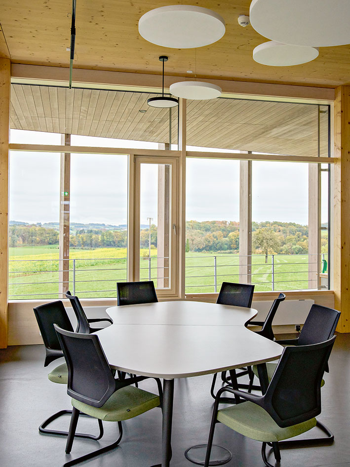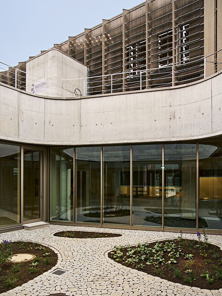The Weleda A.G., headquartered in Switzerland, is one of the internationally operating companies and is therefore also tasked with managing the construction of its branch offices. Instead of renting an anonymous, standard warehouse, those in charge decided to locate their logistics operations in a pioneering new building that aligns with the company’s universally recognized philosophy. This building was to be DGNB Platinum pre-certified and create “a sustainable, people-centered work environment.” The specifications went beyond the company’s productivity goals: the use of regional natural materials such as wood and clay, a self-sufficient energy supply via geothermal and photovoltaic systems, and adherence to the Cradle-to-Cradle principle. Inspired by ecosystems, the site strives to create a natural working environment that—incorporating suggestions from employees—can foster a healthy climate and a pleasant atmosphere through harmonious spatial design and the ecologically sound use of materials. With equal care, the team set out to give the new users of the campus the opportunity to develop an emotional connection to the site through the overall form of the buildings as well as through the detailed design. Weleda and its architects clearly view this project, beyond its economic efficiency, as exemplary of a future-oriented New Work architecture. And that includes the outdoor areas: Clever landscaping combined with regional planting concepts, nesting sites, and extensive greenery aims for biodynamic benefits, for a working environment in the best possible harmony with nature.