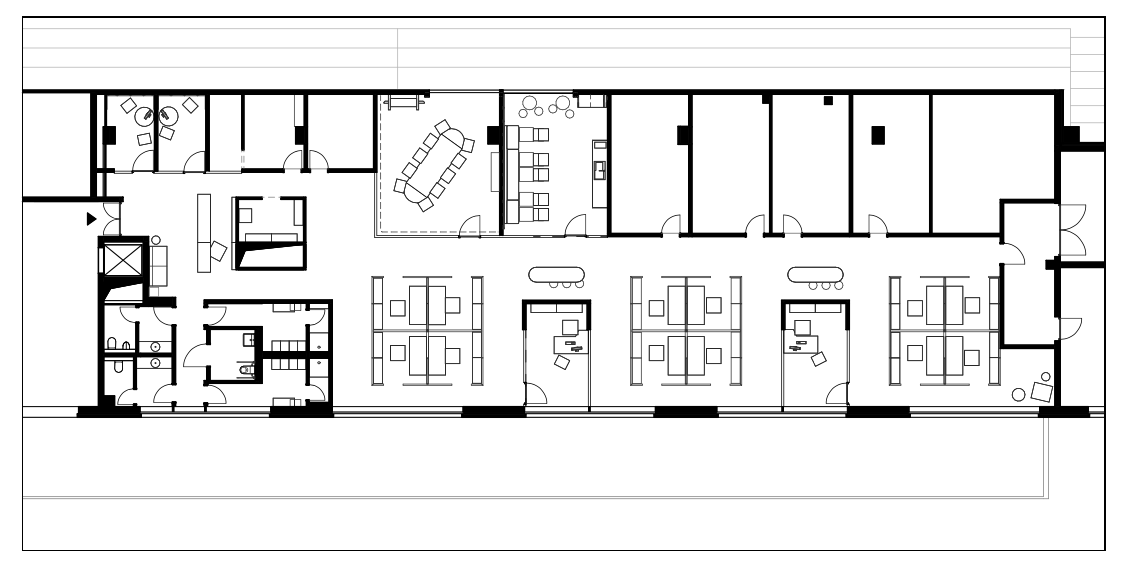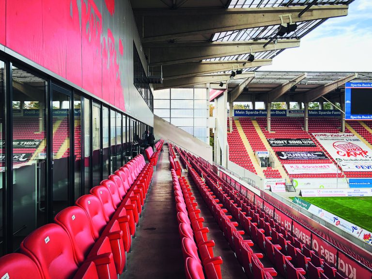 A waiting area for customers and two small counselling offices are located next to it. The internal office structure is characterised by a flexible and open, elongated arrangement of work areas. After the client had defined four working groups with differentiated content, the interior concept developed a separate “island” for each group, whereby the space should continue to be perceived as an open space in order to promote a sense of community and impulsive communication. The half-height parapets of these compartments are acoustically effective due to their surface perforation, which is further supported by textile-covered tops. Between them are transparent management offices on the sides, while two small counters facing the corridor offer the opportunity for quick customer contact. Various seating options at the ends of the long room allow staff to make undisturbed phone calls or have a chat during breaks. As there are only two large windows facing the stadium, the partially glazed conference room and the staff kitchen with a cosy wall bench were positioned here.
